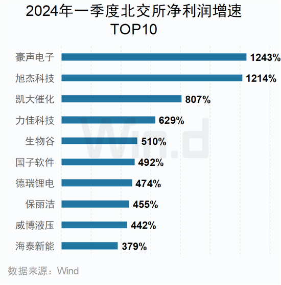 北交所企业中,前十名净利润增速均超过300%,豪声电子以超过12倍的增速位列第一。