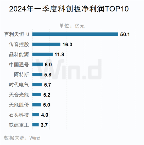 科创板方面,盈利位居前10的主要来自信息技术和工业类公司。百利天恒-U以50.1亿元的净利润位居首位。