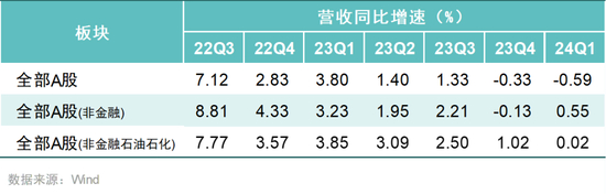 从单季度可比数据来看,2024年一季度,A股上市公司营业收入同比下降0.59%。剔除金融石油石化后,同比增速依次为A股非金融(0.55%)、A股非金融石油石化(0.02%)。