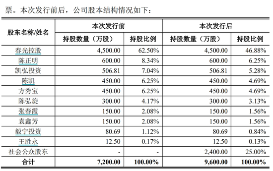 发行前,陈正明家族合计控制春光科技91.5%的股权,前十大股东中除了陈正明家族,就是内部员工、员工持股平台,只有方秀宝一个“外人”。