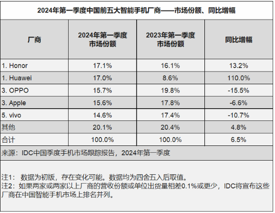 4月25日,国际数据公司(IDC)发布的最新手机季度跟踪报告显示,2024年第一季度,中国智能手机市场出货量约6926万台,同比增长6.5%。与全球市场情况类似,市场需求的持续恢复帮助中国智能手机市场延续去年底的反弹势头,且市场表现高于预期。得益于Honor和Huawei等厂商的良好市场表现,推动了整体Android市场同比增长9.3%。