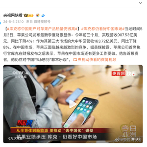 据@央视网快看5月5日报道,苹果公司CEO(首席执行官)库克称中国用户对苹果产品热情仍然很高。在中国市场,苹果正面临越来越激烈的竞争。据美媒披露,库克在财报发布之后表示,苹果在中国市场还有更多工作要做。他告诉投资者,他仍然对中国市场感到“非常乐观”。