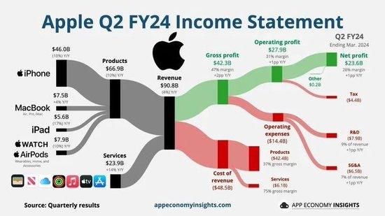 包括Apple Music、TV+流媒体平台、iCloud订阅和App Store业务在内的服务收入在第二财季同比增长14.2%至238.7亿美元,连续五个季度创下新高。这也是苹果当下利润率最高的业务,在其总营收中占比两成。