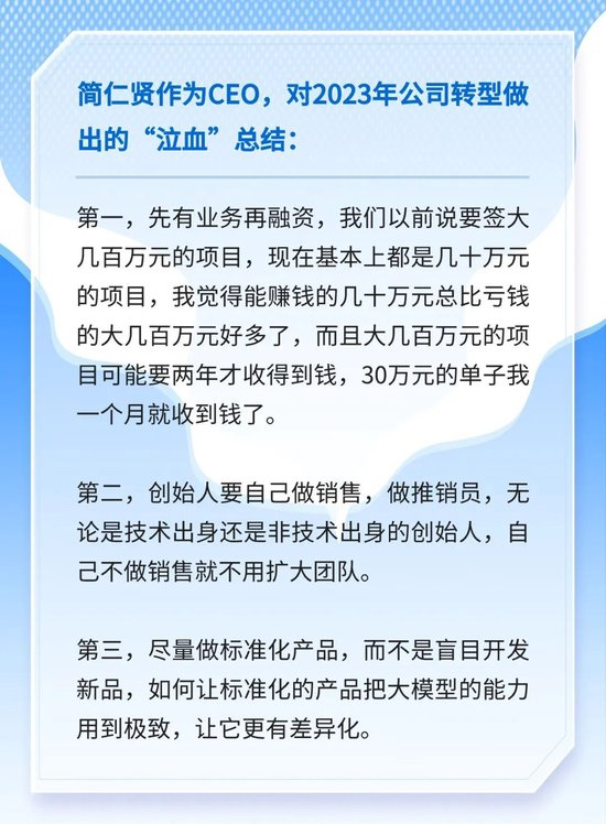 但很快,这次转型被证明是一个巨大的误判——诸多新产品并不能自我造血,客户不认可,它只能带来亏损,拖累公司士气。简仁贤对大模型的态度也从“All in”转变为“Half in”,集中打标品而不是创新产品,利润为先。