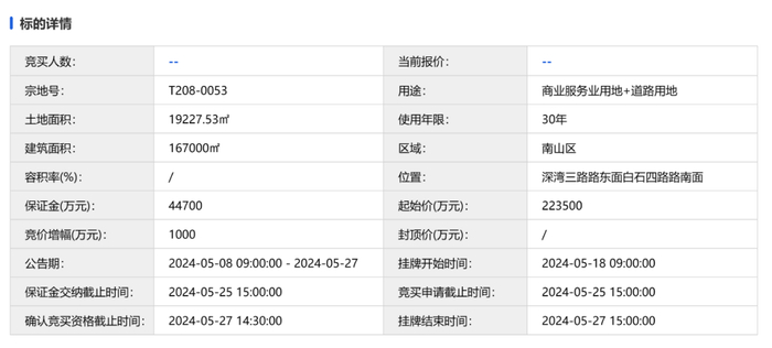 当日早间,深圳湾超级总部基地的T208-0053宗地使用权上线深圳公共资源交易中心,以挂牌方式公开转让,转让起始价约为22.35亿元。公开信息显示,该地块土地面积为1.92万平方米,建筑面积达到16.7万平方米,用途为商服用地+道路用地。