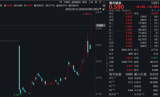 南方锰业(01091.HK)今日股价盘中一度上涨超过40%,收盘涨幅为32.58%。