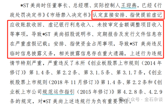 在证监会对ST美尚进行纪律处分决定中,ST美尚女掌门王迎燕确实承认了违规事项,直接安排、指使提前虚记应收账款收回等事项,导致招股书存在严重虚假记载;安排、指使占用资金,导致ST美尚违法披露,违规情节严重。