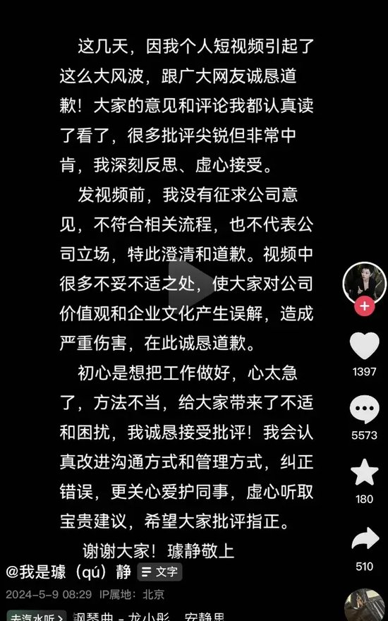 璩静称,“发布短视频之前,我没有事先征求公司意见,不符合相关流程,也不代表公司立场,特此澄清和道歉。视频中很多不妥不适之处,使外部对公司价值观和企业文化产生误解,造成了严重伤害,也在此诚恳道歉”。璩静表示,发短视频的初心是想把工作做好,但心太急了,方法不当,给大家带来了不适和困扰,诚恳接受各种批评。未来将认真改进个人的沟通方式和管理方式,纠正错误,更关心同事。