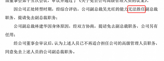 因公司正处转型时期,经综合评估,公司副总裁吴光旺的能力无法胜任副总裁职务,提请免去副总裁职务;公司副总裁林建华因身体原因,经双方协商,提请免去副总裁职务,公司另有任用;经公司董事会审议后,认为上述人员已不再适合担任公司的高级管理人员职务,同意免去上述人员的公司副总裁职务。