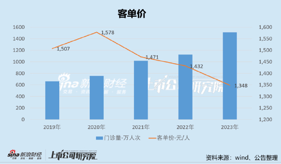2019年至2023年,公司的门诊量分别为662.82万人次、754.87万人次、1019.61万人次、1125.12万人次、1510.64万人次;对应人家客单价分别为1507元/人、1578元/人、1471万/人、1432万/人及1348元/人。可以看出,2020年之前,公司属于量价齐增,而自2020年后,出现增量并不增价,客单价近年持续下滑,2023年客单价较巅峰2020年跌幅达到15%。