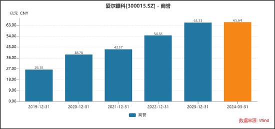 在激进扩张下,爱尔眼科积累了巨大的商誉。截止一季报末,公司的商誉净值为65.64亿元,占公司净资产之比为超30%。