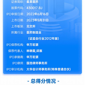 星昊医药IPO项目总得分为75.5分,分类C级。影响星昊医药评分的负面因素是:公司信披质量有待提高,受到全国股转公司处罚,发行费用率较高,上市首日股价破发,上市三个月股价较发行价格下跌,实际募资金额缩水。这综合表明,虽然公司短期内业绩表现较好,但信披质量有待提高,建议投资者关注其业绩表现背后的真实性。