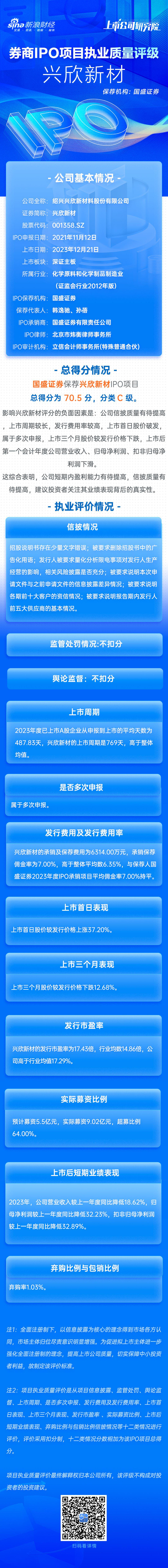 兴欣新材IPO项目总得分为70.5分,分类C级。影响兴欣新材评分的负面因素是:公司信披质量有待提高,上市周期较长,发行费用率较高,上市首日股价破发,属于多次申报,上市三个月股价较发行价格下跌,上市后第一个会计年度公司营业收入、归母净利润、扣非归母净利润下滑。这综合表明,公司短期内盈利能力有待提高,信披质量有待提高,建议投资者关注其业绩表现背后的真实性。