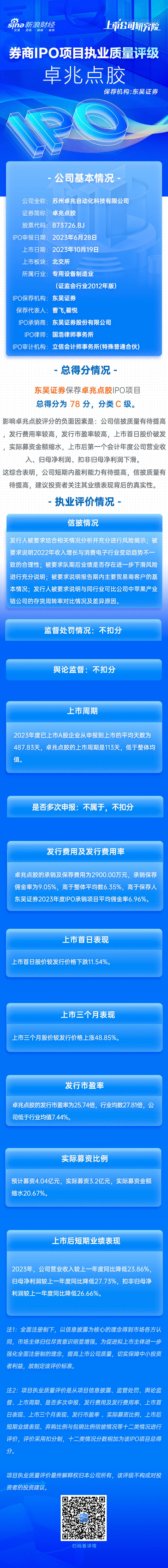 东吴证券保荐卓兆点胶IPO项目质量评级C级 承销保荐佣金率较高 上市首日就破发