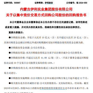 大利好!伊利股份拟以10亿元-20亿元回购股份并予以注销