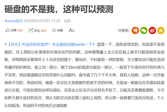 更罕见的是,网络上有人提前40多分钟精准预言了该跌停。根据网传截图,5月20日下午13:47,有人在同花顺平台发帖称,“南京化纤下午2:34给你们来个惊喜哦”,这一预测与当天下午南京化纤股价跳水时间只差一分钟。