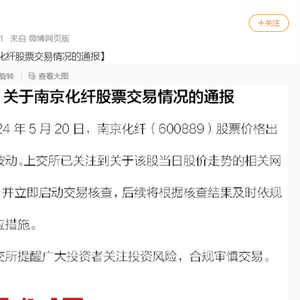 5月21日中午,上交所发布《关于南京化纤股票交易情况的通报》。《通报》指出,上交所已关注到关于该股5月20日股价走势的相关网络信息,并立即启动交易核查,后续将根据核查结果及时依规采取相应措施。