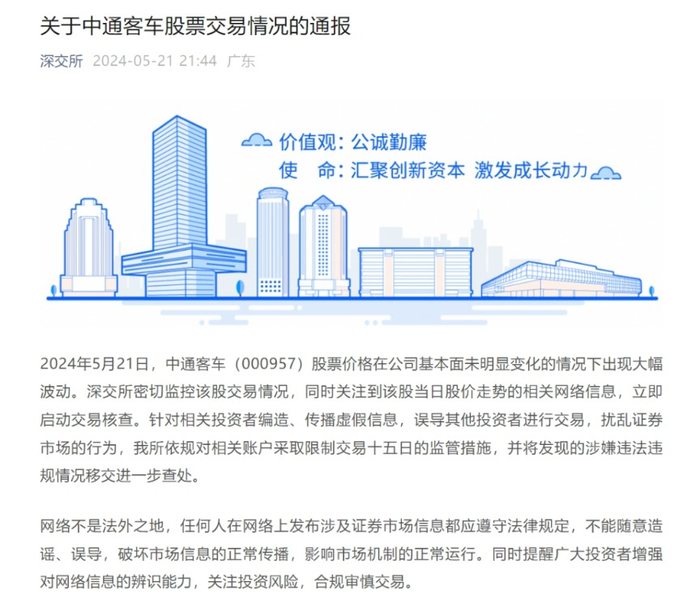 5月21日晚,深交所发布通报称,2024年5月21日,中通客车(000957)股票价格在公司基本面未明显变化的情况下出现大幅波动。深交所密切监控该股交易情况,同时关注到该股当日股价走势的相关网络信息,立即启动交易核查。针对相关投资者编造、传播虚假信息,误导其他投资者进行交易,扰乱证券市场的行为,我所依规对相关账户采取限制交易十五日的监管措施,并将发现的涉嫌违法违规情况移交进一步查处。网络不是法外之地,任何人在网络上发布涉及证券市场信息都应遵守法律规定,不能随意造谣、误导,破坏市场信息的正常传播,影响市场机制的正常运行。同时提醒广大投资者增强对网络信息的辨识能力,关注投资风险,合规审慎交易。