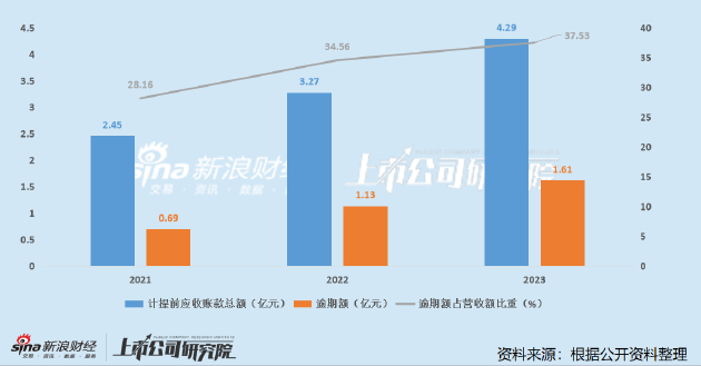 近三年间,公司应收账款持续提升,报告期内分别为2.45亿元、3.27亿元、4.29亿元,同时逾期额占比也由2021年的28.16%持续上升至 2023年的37.53%,应收账款回收及减值计提风险值得关注。