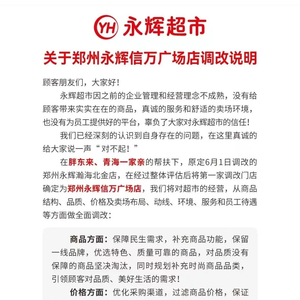在胖东来、青海一家亲的帮扶下,原定6月1日调改的郑州永辉瀚海北金店,在经过整体评估后将第一家调改门店确定为郑州永辉信万广场店。永辉超市将对超市的经营,从商品结构、品质、价格及卖场布局、动线、环境、服务和员工待遇等方面做全面调改,包括商品、价格、环境、员工以及营业时间等方面。