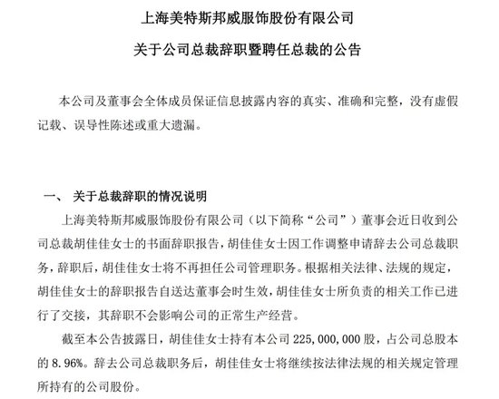 2024年1月,美邦服饰公告称,因工作调整,胡佳佳相继申请辞去董事长、总裁等职务,此后将不再担任美邦服饰管理层职务。同时,董事会同意选举周成建为美邦服饰新一任总裁,并出任董事长一职。