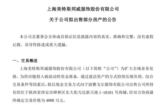 2023年12月,美邦服饰发布了《关于公司拟出售部分房产》、《关于控股股东所持公司股份将被司法拍卖》两份公告。据美邦服饰发布的《关于公司拟出售部分房产》,公司拟以现金交易方式向雅戈尔服饰出售公司所持有的位于陕西省西安市碑林区东大街万达新天地1-10101号商铺,最终确定交易价格为4000万元。