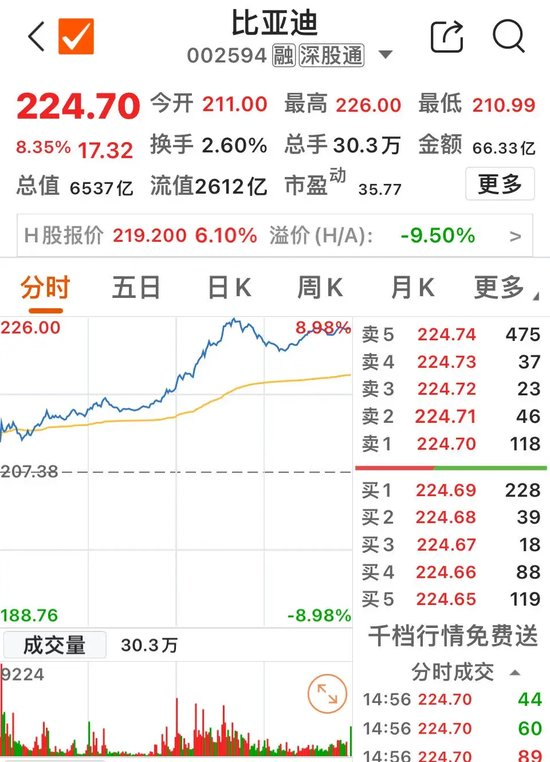 今日,比亚迪股价高开高走,午后涨幅明显扩大。截至收盘,比亚迪报224.70元,上涨8.35%,全天放量成交66.33亿元,公司最新市值6537亿元。