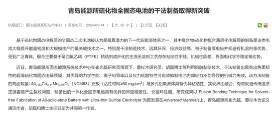 据中国科学院青岛生物能源与过程研究所消息,近日,该所固态能源系统技术中心团队利用熔融黏结技术,干法制备出具有出色柔韧性的超薄硫化物固态电解质膜,其优异的力学性能、离子电导率以及应力耗散特性可有效抑制电池内部应力不均导致的机械力失效。该方法制备出的一体化全固态电池具有优异的界面稳定性、长循环性能。