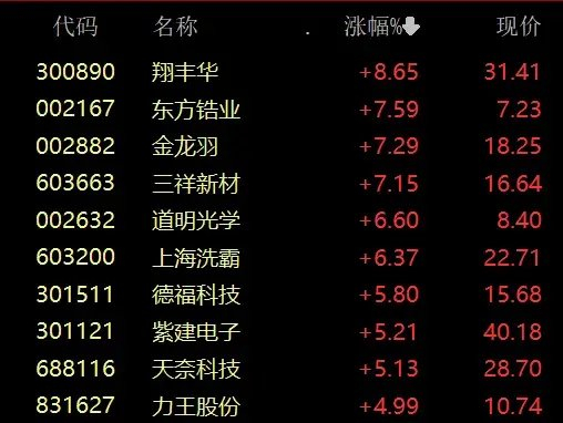 比亚迪大涨提振相关新能源题材的资金情绪。今日尾盘,固态电池概念多股异动,金龙羽股价一度直线触及涨停,翔丰华最高涨超14%。截至收盘,翔丰华上涨8.65%,金龙羽、东方锆业、三祥新材涨超7%。