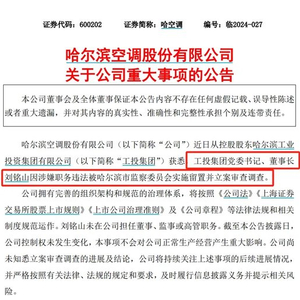 哈空调(600202)6月3日晚间公告,公司近日从控股股东哈尔滨工业投资集团有限公司(以下简称“工投集团”)获悉,工投集团党委书记、董事长刘铭山因涉嫌职务违法被哈尔滨市监察委员会实施留置并立案审查调查。