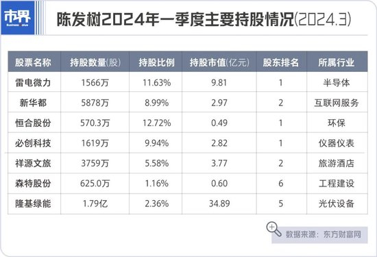 2023年10月,陈发树以380亿人民币财富位列胡润百富榜第122位。「市界」查询东方财富网,截至2024年3月底,除云南白药外,陈发树手中最新持股数量为七支,分别为雷电微力、新华都、恒合股份、必创科技、祥源文旅、森特股份、隆基绿能,累计持股市值超55亿。