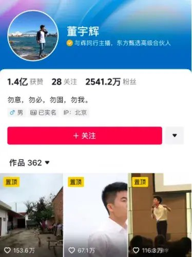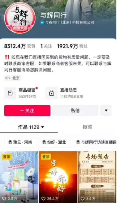 2023年12月底,董宇辉创立新账号“与辉同行”,从东方甄选分拆。截至目前,董宇辉个人抖音账号的粉丝量已经超过2500万。董宇辉自立门户的直播间“与辉同行”粉丝量也一路上涨,截至目前,已超1920万。