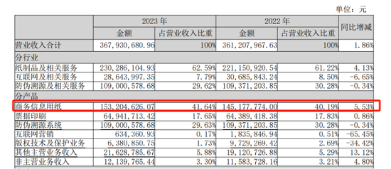 从毛利率看,商务信息用纸、防伪溯源系统、票据印刷2023年毛利率分别为5.99%、20.38%、20.10%。可见,占据近半营收的商务信息用纸业务,实际上毛利率最低,难以贡献太多盈利。