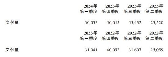 官方数据显示,2024年第一季度,蔚来汽车交付量约3万辆,较2023年第一季度下滑了3.2%,较2023年第四季度下滑了39.9%。