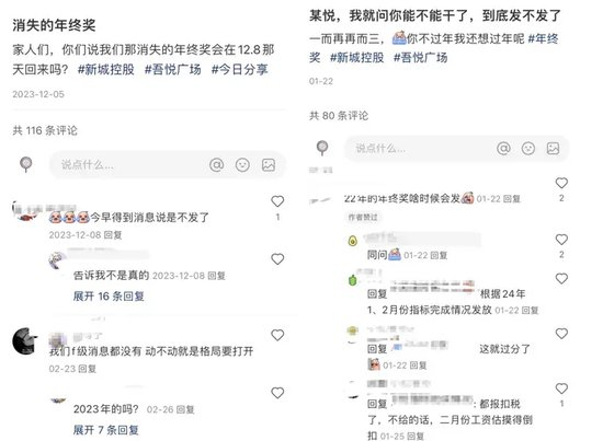 在小红书等社交平台上,有很多用户表示讨论新城员工2022年和2023年的员工年终奖,一些用户表示2022年的年终奖至今还没发,其他用户则表示拿到了一部分,也有用户称自己项目的年终奖都发完了。从发文内容看,部分用户来自是新城吾悦广场。