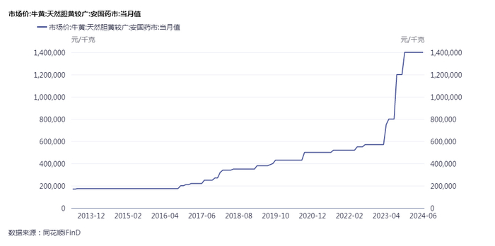记者从同花顺iFinD的数据看到,近年来,作为安宫牛黄丸的主要材料之一,天然牛黄价格大幅上涨。从2023年1月的57万元/公斤上涨至当前的140万元/公斤,其间累计涨幅超140%。