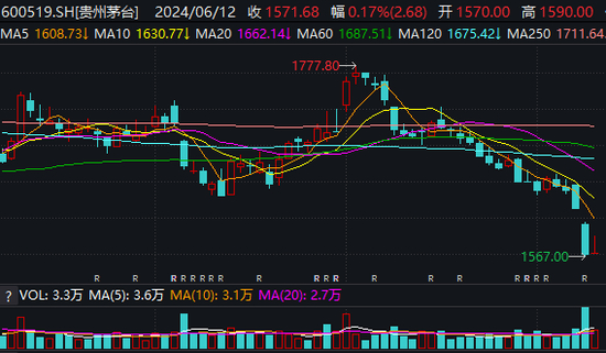 6月12日,贵州茅台收盘报1571.68元/股,上涨0.17%。而在6月11日,贵州茅台受“黄牛”反水传言影响,股价大跌3.1%,报1569元/股。