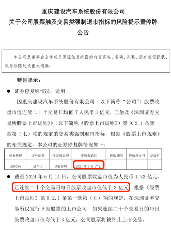 上述公告显示,截至2024年6月14日,建车B股票收盘市值为人民币1.33亿元,已连续20个交易日每日股票收盘市值低于3亿元,根据相关规定,在深圳证券交易所仅发行B股股票的上市公司,如果连续20个交易日的每日股票收盘市值均低于3亿元,公司股票将被终止上市交易。