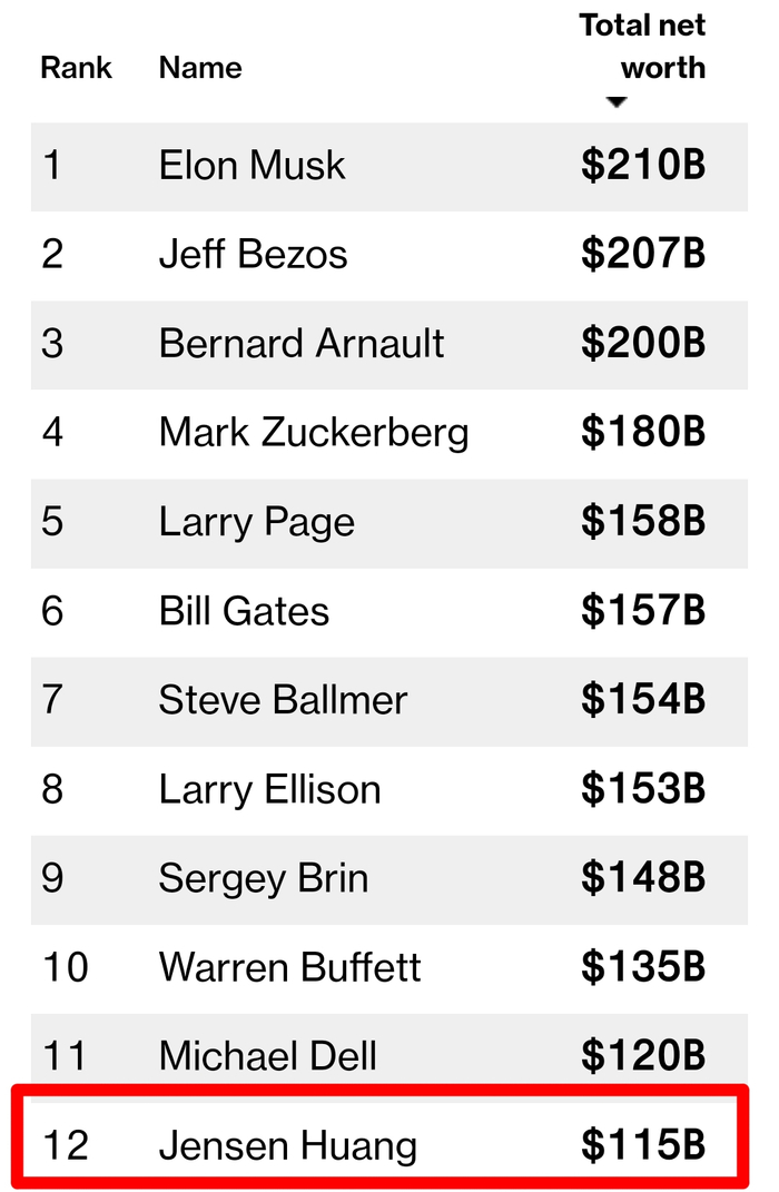在过去一年半中,英伟达股价和市值维持上涨趋势。截至英伟达“一拆十”拆股前最后一个交易日6月7日收盘,英伟达年内股价已上涨144.12%,与2023年年初相比,英伟达股价则已上涨727.61%。拆股后,当地时间6月10日~6月17日,英伟达股价又累计上涨8.36%。随着英伟达股价变化,黄仁勋身价水涨船高。据彭博全球亿万富豪实时排行榜,截止6月18日,黄仁勋在该榜单中排行第十二, 总净资产1150亿美元。