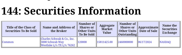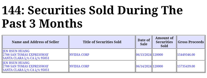 此外,据英伟达披露的文件,英伟达CEO黄仁勋于6月13日和6月14日共卖出24万股股票,出售价格介于127美元~133美元之间,套现3118万美元。这是过去3个月中黄仁勋仅有的两笔减持记录。周一收盘后,英伟达又披露了一份表格,预计黄仁勋将在周一卖出12万股公司股票,涉及股票总市值1581万美元。