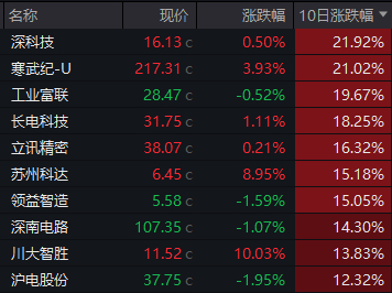 以近10个交易日的累计涨跌幅看,英伟达产业链概念股中,工业富联、长电科技、中际旭创等分别上涨19.67%、18.25%、17.77%;AI应用板块中,深科技、寒武纪、立讯精密等分别上涨21.92%、21.02%、16.32%;AI算力板块中,新易盛、ST证通、天孚通信等分别上涨19.62%、16.23%、11.65%。