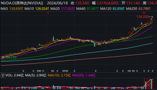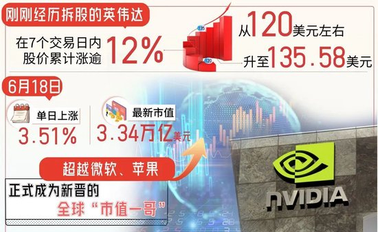 Wind数据显示,截至6月18日收盘,英伟达股价单日上涨3.51%,报收135.58美元。英伟达市值至此已猛增至3.34万亿美元,不仅与三巨头之一的苹果(3.29万亿美元)拉开了距离,也一举超过长期霸占市值第一宝座的微软(3.32万亿美元),成为新晋“全球市值一哥”。