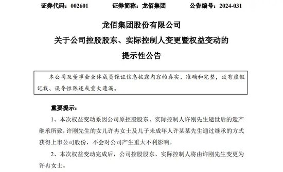 6月20日晚间,钛白粉巨头龙佰集团(002601)及其旗下东方锆业(002167)同步披露,因公司原控股股东、实控人许刚逝世后的遗产继承所致,许刚的女儿许冉及儿子未成年人许某某通过继承的方式获得公司股份,不会对公司产生重大不利影响。本次权益变动完成后,公司控股股东、实控人将由许刚变更为许冉。