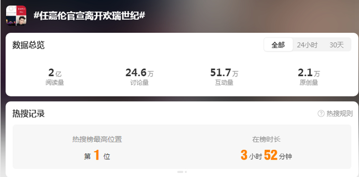 消息爆出后,迅速引发网友热议。微博话题“任嘉伦官宣离开欢瑞世纪”一度冲上热搜第一。截至发稿前,该话题仍位列榜单第七位,阅读量达2亿次,讨论量达24.6万次,互动量为51.7万次。任嘉伦本人发布的官宣消息也获得超46万次转发,评论数超13万个。