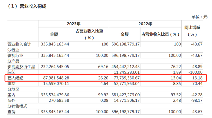 营收方面,欢瑞世纪去年实现营业收入3.36亿元,同比减少43.67%。具体营收构成中,除了艺人经纪收入同比增加13.18%之外,其余同比均出现下滑,如影视剧销售收入同比减少48.89%,综艺同比减少100%,电商同比减少70.44%等。