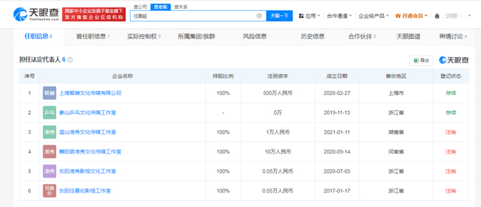 另据天眼查显示,任嘉伦在6家公司担任法定代表人,目前只有2家公司存续,分别为上海智赫文化传媒有限公司、象山乒乓文化传媒工作室。