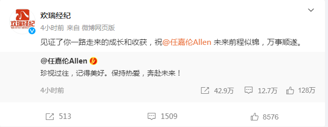 欢瑞经纪也对此事进行了回应:“见证了你一路走来的成长和收获,祝任嘉伦未来前程似锦,万事顺遂。”
