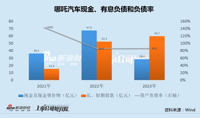 近三年来,哪吒汽车累计亏损183亿元,尽管不停对外融资,2023年在手现金也只有28.4亿,不够半年的亏损,同时长、短期借款接近60亿,负债率从2021年的144%有所下降,但仍高达86%,且继续融资的能力明显趋弱。