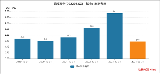 值得注意的是,公司同时出现“大存大贷”现象,即账面资金较高的同时,公司的有息债务也保持较高。Wind数据显示,2019年至2024年一季度末,公司的货币资金分别为40.87亿元、41.96亿元、47.03亿元、50.96亿元、77.21亿元、67.55亿元;同期有息债务分别为79亿元、82.69亿元、114.44亿元、136.79亿元、183.25亿元、209.23亿元。