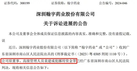 7月3日晚间,深圳翰宇药业股份有限公司(简称“翰宇药业”)公告称,公司原董事、高级管理人员袁建成犯挪用资金罪,被广东省深圳市南山区人民法院(简称“南山区人民法院”)判处有期徒刑三年六个月。
